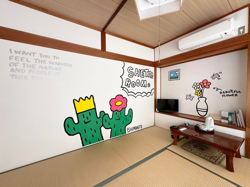 「宿坊」と聞いて、もっとストイックな雰囲気を想像していましたが、実際はビジネスホテルのように気軽で快適に過ごせることに驚きました。特に、SHETAさんのイラストが描かれたユニークなお部屋は、お寺の厳かな雰囲気とのギャップが魅力的。窓のすぐ外には線路が通っていて、時折電車が走っていく光景は、ここ岩本寺ならではの面白い体験でした。