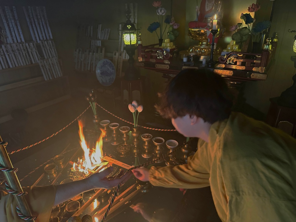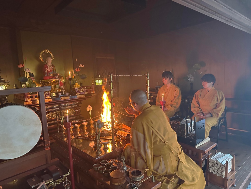 続いては作務衣に着替え、火の力で心を清め新たな一歩を踏み出す「護摩焚き」をしました。