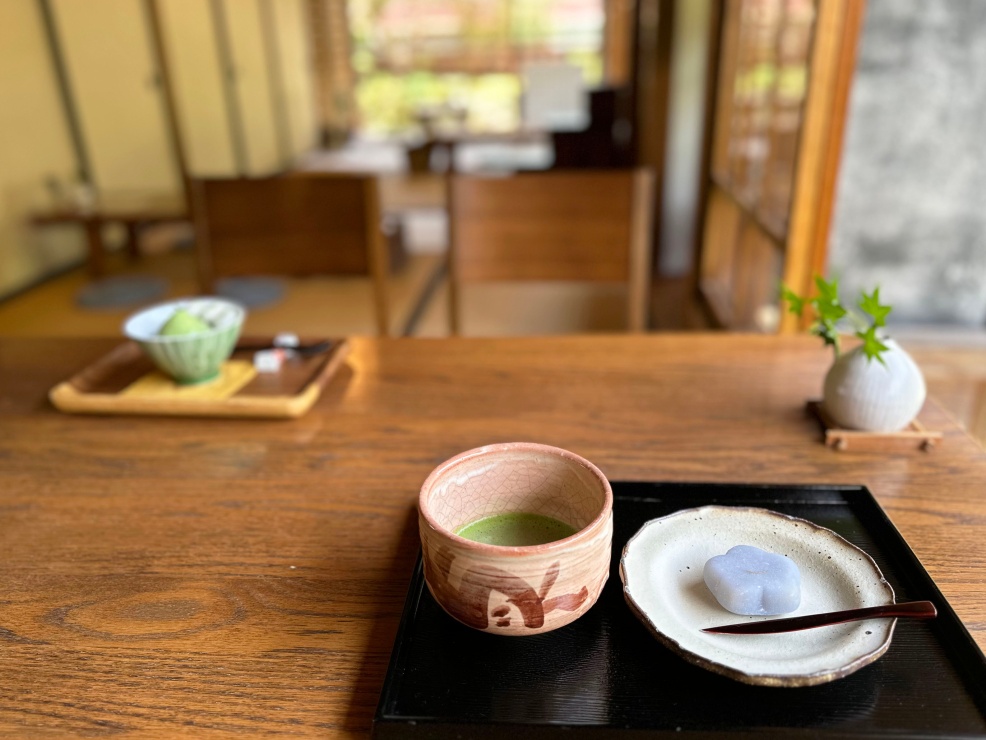 ここでは、地元の和菓子の老舗「松鶴堂」さんの季節の和菓子と、カフェの名物「こんまいパフェ」をいただきました。この日の和菓子は、秋の訪れを感じさせる「桔梗(ききょう)もち」。上品で優しい甘さが口の中に広がり、あたたかいお抹茶と一緒に味わうと、心までほっと温まるのを感じました。