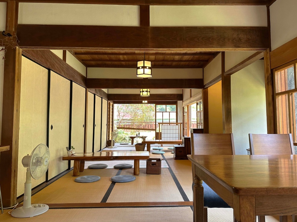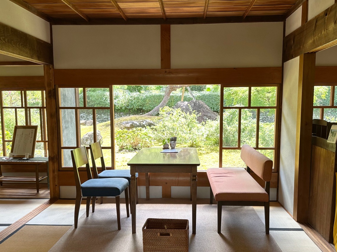 築100年の歴史を感じさせる古民家は、大きな窓から光が差し込み、美しい庭の緑を眺めながらゆったりと過ごせる、心安らぐ空間です。