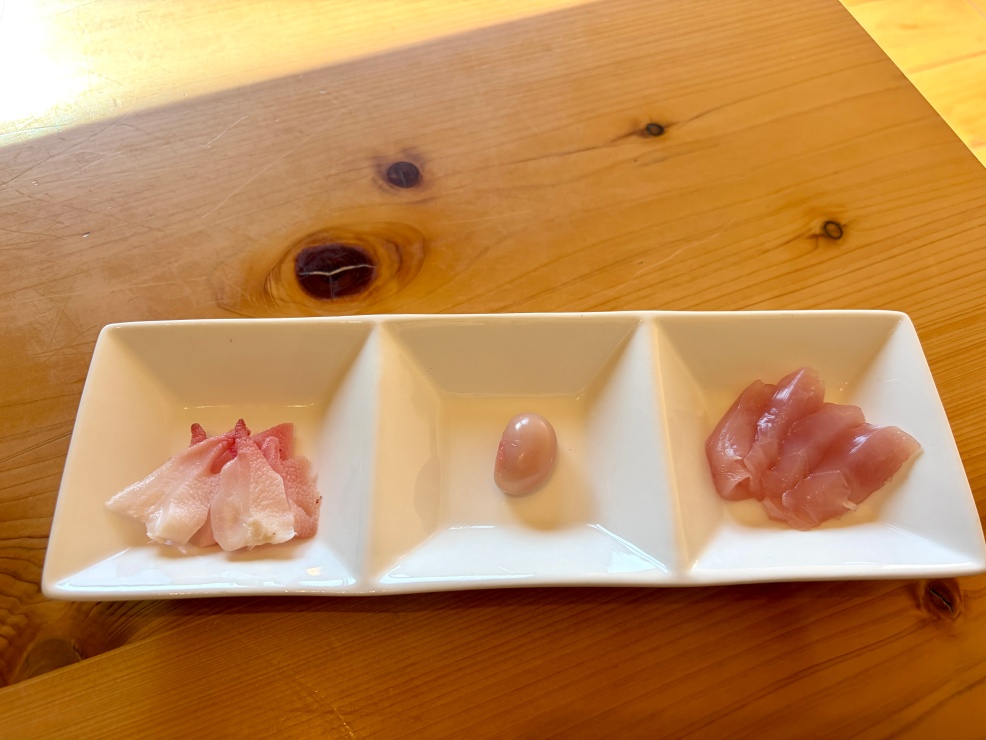 「普段食べている鶏肉はトサカや白子ができる前にお肉にされるので、なかなかこの2つを日本で見る機会がないんですけど」と、女将のケイコさん。一般的な養鶏が45日ほどで出荷されるのに対し、土佐ジローは150日とゆっくり時間をかけて育てられるためトサカも白子も成長するそうです。