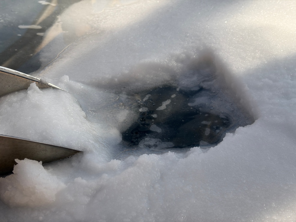まずは、海水を全体的に混ぜる作業からスタートです。ヘラを滑らせると、水面で塩の結晶がキラキラと光り、思わず見惚れてしまうほどの美しさ✨ 日の当たり方や季節によって混ぜ方を変えながらこの作業を繰り返していくそうです。