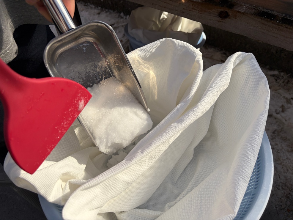 仕上げは、木箱の真ん中に集まった真っ白な結晶をすくい上げる採塩作業。