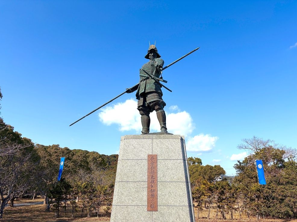 鋭い視線は、かつての主戦場であった長浜平野と、その先に広がる太平洋へと向けられています。これからはじまる激動の時代を見据えるような、静かな気迫を漂わせる像です。