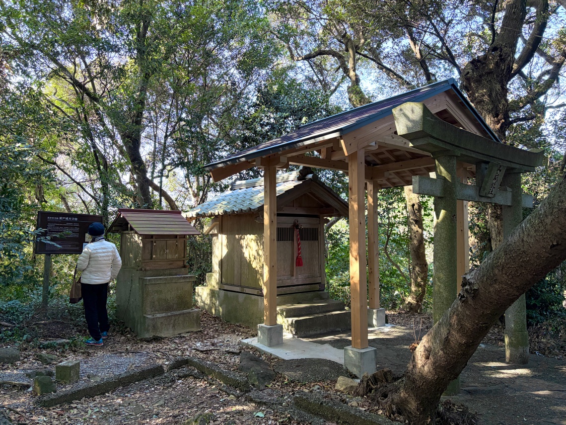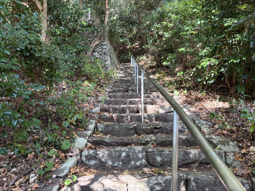 記念館でガイドブックをもらい、散策スタート。浦戸城跡には、天守や井戸、曲輪跡など土佐の城郭史上貴重な遺構が遺り、当時の面影を静かに伝えています。木々に囲まれた道を通って、一段高い場所にある天守跡へと歩を進めると、木立の中に小さな平地が現れます。木々の間からは太平洋を望むことができました。「鉄壁の要塞」と呼ばれた浦戸城の守りの固さを肌で感じることができます。