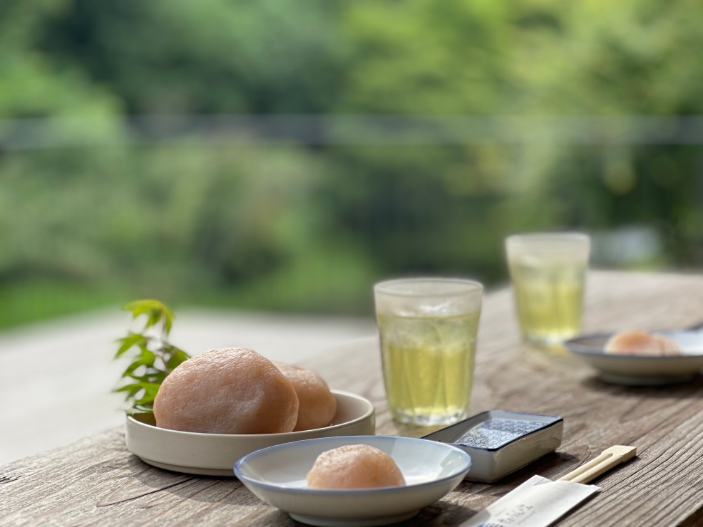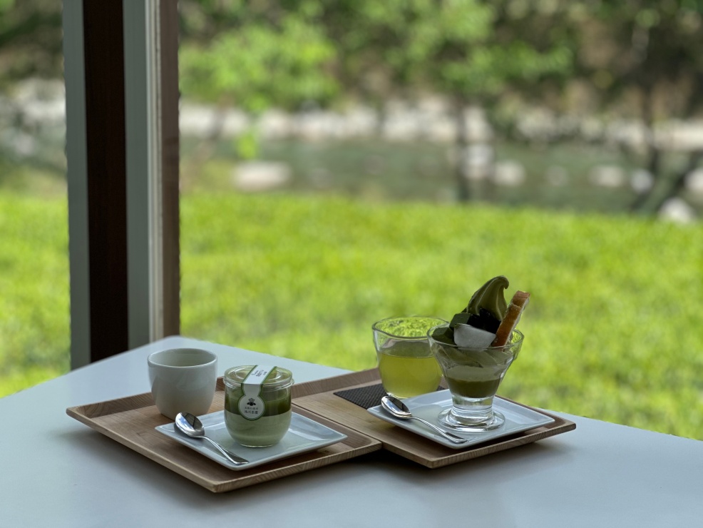テラス席に座ると、目の前に茶畑が広がります。お茶の香りと涼やかな川のせせらぎが、心を満たす初夏のひとときを演出してくれます。