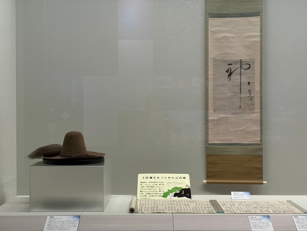 一豊公の所用品などを展示するコーナーがあり、こちらも定期的に入れ替えが行われています。この日は公が愛用したと伝わるフェルト製の南蛮帽(なんばんぼう)や、一豊公の筆とされる「神」と書かれた一筆書を鑑賞することができました。