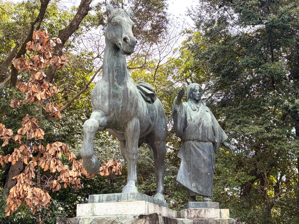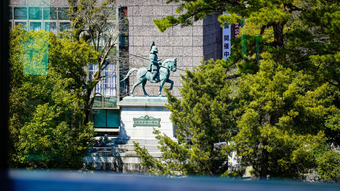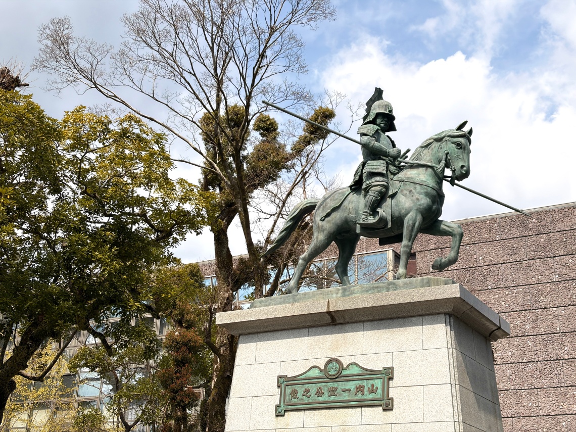 追手門の近くには、馬を駆る勇壮な山内一豊の銅像が立っています。大正2年に建立された初代の像は、戦時中の金属回収令によって惜しくも供出されてしまいました。現在の像は、平成8年に再建された「2代目」。宿毛出身の彫刻家・本山白雲が手掛けた初代の「雛形(縮小像)」をもとに再現されたもので、その貴重な雛形は、先ほど立ち寄った高知城歴史博物館に収蔵されているそうです。