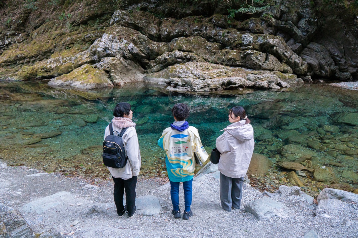 安居渓谷は透明度が際立つスポットです。ガイドさんの案内でじっくり堪能するのがおすすめです!