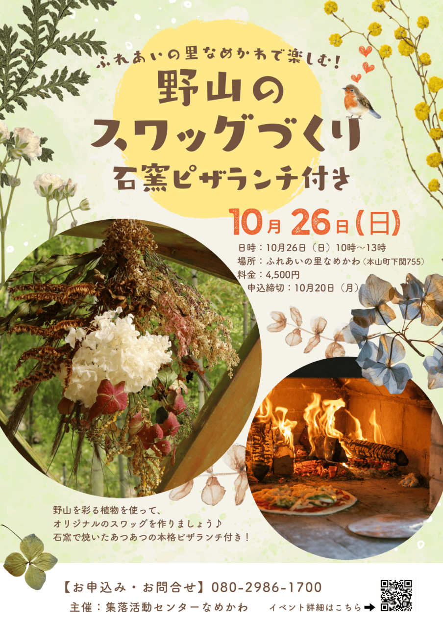 【本山町】野山のスワッグ作り体験&石窯ピザランチ付き|ふれあいの里なめかわ 2025.09.26