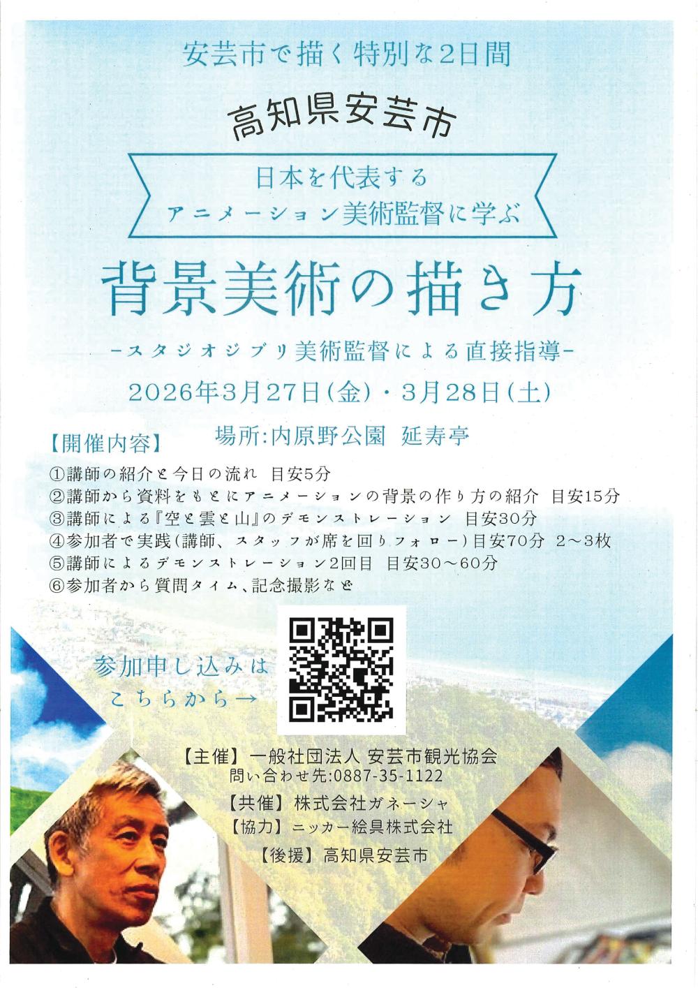 多くのスタジオジブリ作品を手掛けてきたアニメーション美術監督 武重洋二さん、西川洋一さんが講師を務める講座を開催します。 アニメーション制作現場で実際に用いられているポスターカラーで、青空やそこに浮かぶ雲、山を描きます。 世界的にも著名なお二方から直に背景美術を学ぶことができるまたとない機会です。 絵を描くのが初めての方でも安心してご参加いただけます。 皆様のご参加をお待ちしています。 申込み〆切 2月28日(土) ◎詳細・申込みはこちら