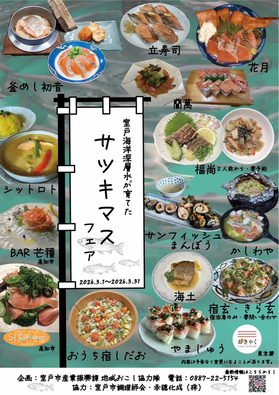 アメゴが海へ下り、たくましく成長して再び川へ戻ってくる――それが「サツキマス」です。 室戸では、室戸海洋深層水の特長を活かし、サツキマスの養殖が行われています。清浄な深層水で大切に育てられたその身は、澄んだ味わいと上品な旨みが特長です。 フェア開催期間中は、室戸市内13店舗に加え、高知市や東京でも提供予定。参加店舗ごとに趣向を凝らした多彩なメニューが楽しめます。 この機会に、室戸が育んだサツキマスの魅力を、ぜひご堪能ください。