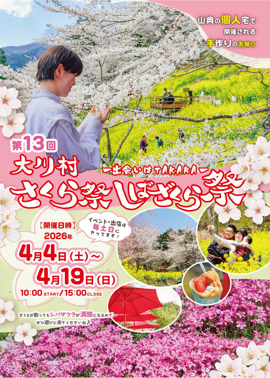 大川村の代表的なイベントの一つである「大川村さくら祭・しばざくら祭」。 村外からのお客様も多く訪れる、人気のイベントです! 大川村に暮らす川上さんご夫妻が自分たちの手で10年かけて自宅の裏山を切り拓き、100本もの桜を植えたことがきっかけで始まりました。 開催期間中毎週土・日曜日には、イベントや出店もあります! さくらの花が散っても、しばざくらが満開になりますので、期間中何度でも楽しめるイベントです♪ 最新情報は大川村さくら祭のFacebookやInstagramで更新されますので要チェック! ぜひお誘いあわせのうえお越しください! 開催期間 2026年4月4日(土)~2026年4月19日(日) 10:00~15:00 場所 高知県土佐郡大川村井野川268-10 [Googleマップを開く] 料金 高校生以上の方は、施設整備金として一人500円のご協力をお願いしております。 備考 無料駐車場あり ※自家用車等でのお越しをおすすめいたします。 ※足元の悪い場所もございますので、ぜひ歩きやすい靴でお越しください。