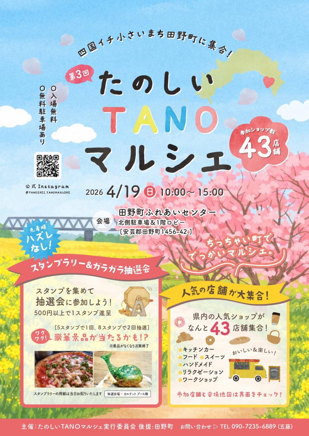 ちっちゃい町ででっかいマルシェ。 出店数はなんと43店舗!県内の人気ショップが大集合! おいしいグルメ、かわいいハンドメイド雑貨、ほっと癒されるお店までいろいろ♪ みんなで楽しめるワークショップもあります。 スタンプラリー&ガラガラ抽選会も! はずれなし、豪華景品が当たるかも⁉ ふらっと遊びに来たくなる、楽しいマルシェです! ◎たのしいTANOマルシェ〈Instagram〉