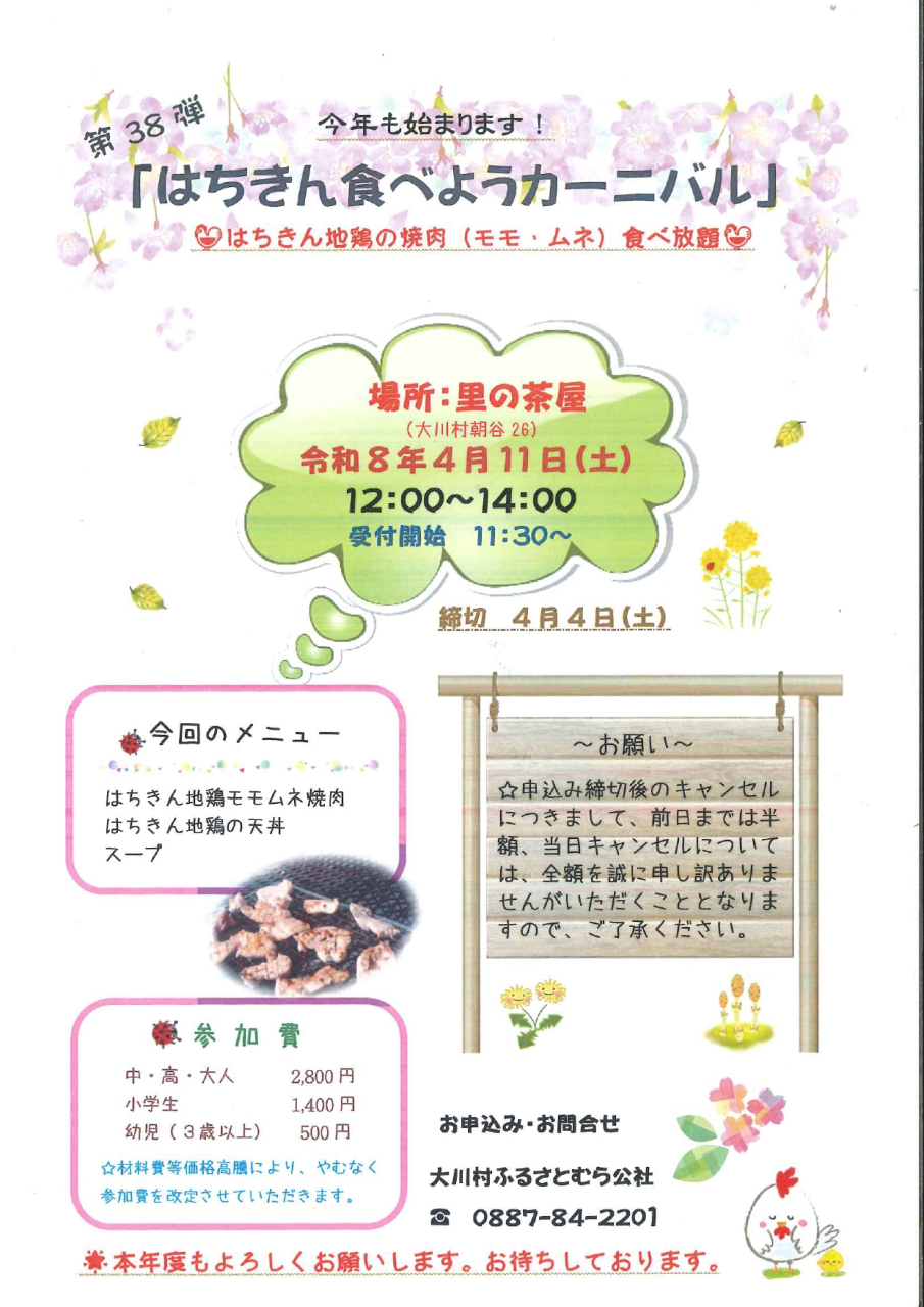 県外にはめったにお目にかかれない、 人気のはちきん地鶏食べ放題BBQイベント! 旨味たっぷり、地鶏特有のクセが少なくさっぱりした味わいの地鶏「土佐はちきん地鶏」 そのほとんどを大川村が生産しています。 そんな県外にはめったに出回らない地鶏が、炭火焼BBQでお腹いっぱい食べ放題のイベントです! はちきん地鶏(モモ、ムネ食べ放題)のほか、 はちきん地鶏の天丼、スープなどBBQ以外のメニューも全て食べ放題! キャベツや玉ねぎなどのお野菜もついています。 お茶は飲み放題、その他のドリンクも販売します。 屋根のある東屋で開催しますので、雨の日でも安心です。 2026年初の開催です! 春の風に吹かれながら大川村に地鶏グルメを堪能しに来ませんか? 「里の茶屋」の営業開始は4月3日(金)から! 2026年の「里の茶屋」の営業は、4月3日(金)からとなっております。 営業日は金・土・日曜日、月~木曜日は休業日ですので、お越しの際は営業情報をご確認ください。 日時 2026年4月11日(日) 12:00~14:00(受付11:30~) 参加費 中学生・高校生・大人 2,800円(税込) 小学生 1,400円(税込) 幼児(3歳以上) 500円(税込) ※2026年4月より、材料費等価格高騰によりやむなく参加費を改定させていただきます 定員 50名 場所 白滝の里 里の茶屋 住所:高知県土佐郡大川村朝谷 締切 2026年4月4日(土) ※申込締切後のキャンセル料について 前日までは半額、当日キャンセルについては全額いただくこととなりますのでご了承ください。 備考 料金に飲み物は含まれません。(ビール、酒、ソフトドリンク、ノンアルコールビール等販売しています。) お茶はご用意しています。 お申込み・お問い合わせ 大川村ふるさとむら公社 0887-84-2201 自然王国 白滝の里