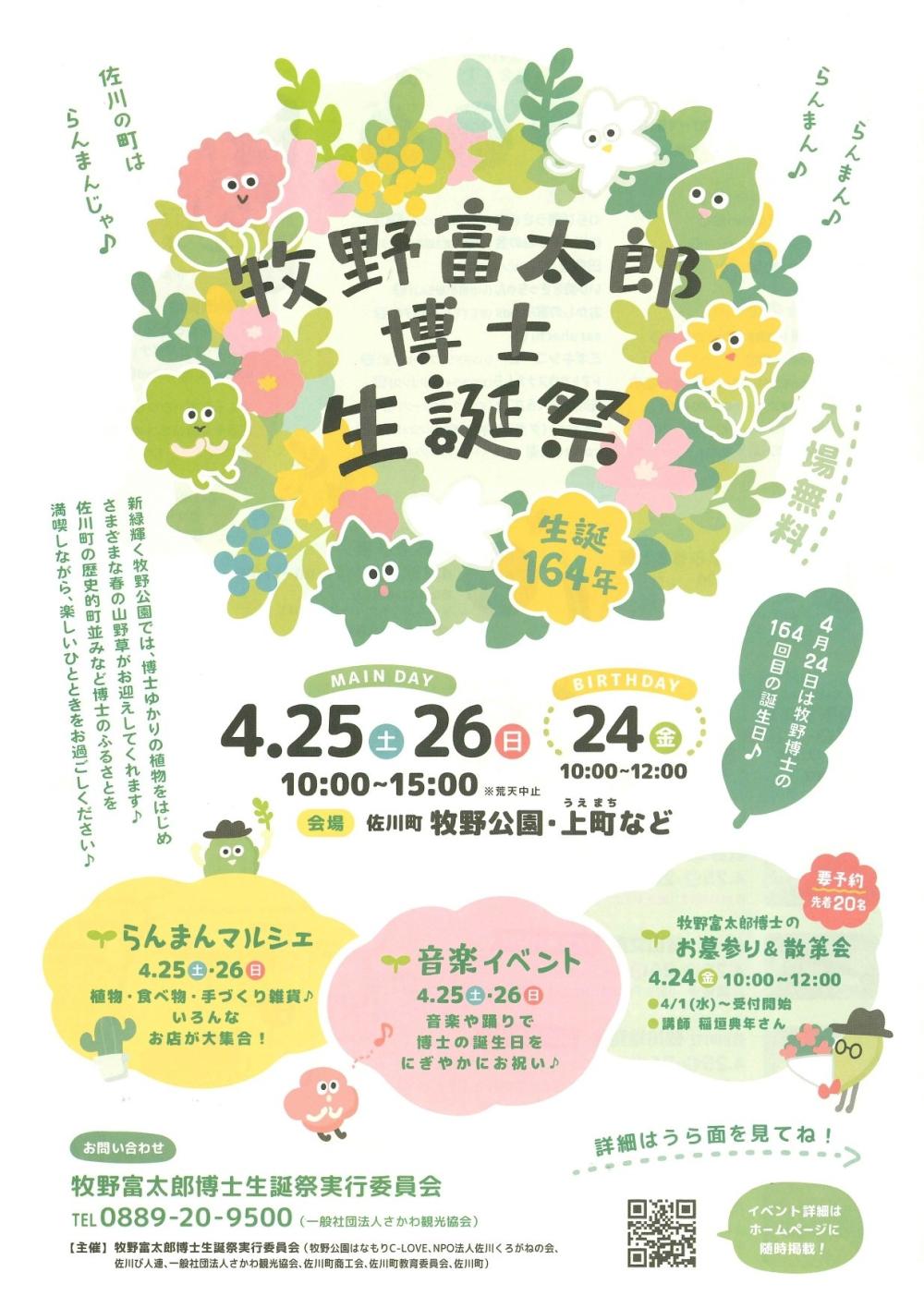 ①らんまんマルシェ 4/25・26 10:00~15:00 場所:牧野公園 ★植物★ ・くらサボ(多肉植物、サボテン) ・はなもりCーLOVE(山野草) ・はなもりCーLOVE(コケ玉作りワークショップ) ※25日のみ ・rourin(ビカクシダ) ※26日のみ ★飲食 ・わらび餅 うさぎ堂(わらび餅・ドリンク) ・佐川くろがねの会(山椒餅・富太郎まんじゅう) ・田舎屋(軽食・ドリンク) ・いか焼きさっちゃん(いか焼き【粉もん】) ・お菓子の家Repos(きらずもち、焼き菓子など) ※25日のみ ・saruhachi ・ミギキシコーヒー(ハンドドリップコーヒー、豆) ※25日のみ ・トマトハウスナカムラ(ガパオライス、ドリンク) ※26日のみ ・佐川高校さくらカフェ(ドリンク、スウィーツ) ※26日のみ ・da zero(新玉ねぎのパンナコッタなど) ※26日のみ ・coffee山遊(コーヒー、ドリップバッグ) ※256日のみ ★雑貨・その他★ ・魔女と月の樹(幻想雑貨・タロット占い) ・N and N(布雑貨) ・工房 玻璃(あみもの雑貨、牧野君のあみぐるみ) ・molingit(山野草プレート、その他小物) ・トサ・スラックライン(スラックライン、すらっクレール体験) ※25日のみ ・高知ファイティングドッグス(ストラックアウト、グッズ販売) ※26日のみ ②牧野富太郎博士のお墓参り&散策会 4/24㈮ 10:00~12:00 受付:事前予約制 さかわ観光協会 TEL 0889-20-9500 料金:無料 集合場所:名教館 ③♪音楽イベント♪ ・坂野志麻さん(アコーディオン) ・サメポンさん(バルーンアーティスト) ・花園保育園 ※25日のみ ・バンドふるさと ※25日のみ ・マカナ・オカアイナ ※25日のみ ・Nakatosa Steelpunk Band Oh!No!!Me!!!(スティールパン) ※26日のみ ・さくらスポーツクラブ合唱団 ※26日のみ ・おきゃく屋 (よさこい) ※26日のみ ・ア・サンテ (コーラス) ※26日のみ ④草あそび展 4/23㈭~29㈬ 9:00~17:00 場所:佐川文庫庫舎 ⑤生誕祭写真展 4/18㈯~5/10㈰ 9:00~17:00 場所:名教館 ⑥草花で作ったバースデーケーキ 場所:牧野公園 ⑦牧野公園ガイド 4/25.26 ①11:00~ ②13:00~ 受付場所:当日受付 総合案内にて 料金:無料 当日入館料無料施設 佐川町立青山文庫・佐川町立佐川地質館