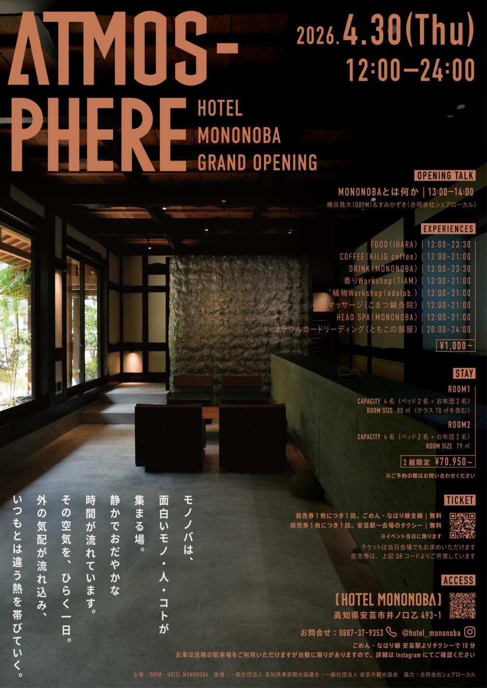かつて地域の拠りどころだった病院が、宿泊施設として生まれ変わりました。 「HOTEL MONONOBA」のグランドオープンにあわせて、イベントを開催します。 オープニングトークやお食事、鍼灸マッサージ、ワークショップなど、多彩な体験をお楽しみいただけます。 現在、イベントチケット販売中です。 チケットには、ごめん・なはり線全線の片道乗車、または安芸駅〜HOTEL MONONOBA間のタクシー片道利用(いずれもイベント当日のみ有効)が含まれています。 詳細はこちら 新しく生まれ変わった空間で、特別なひとときをお楽しみください。 HOTEL MONONOBA〈Instagram〉