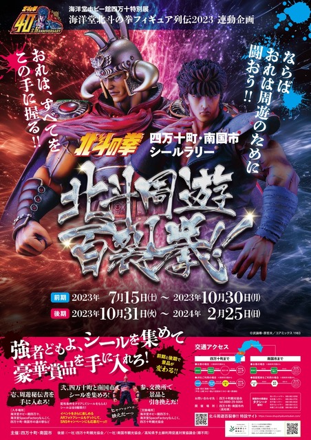 今年連載40周年を迎える漫画「北斗の拳」をテーマに開催される海洋堂ホビー館四万十特別展「海洋堂北斗の拳フィギュア列伝2023」との連動周遊企画「四万十町・南国市シールラリー 北斗周遊百裂拳‼」。