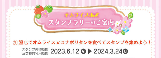 加盟店でオムライスまたはナポリタンを食べてスタンプを集めよう!5店舗制覇で1,000円割引または10店舗制覇で2,000円割引の選べる特典が!全店制覇者には全員に日高村オリジナルグッズをプレゼント。さらに抽選で33名様に豪華プレゼントが当たる!