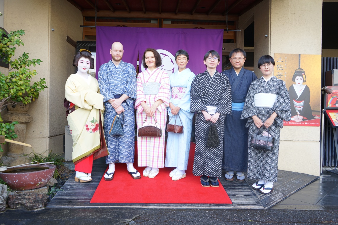 ・呉服屋で和装に着替え、お座敷遊びへのスイッチを入れ、ガイドの指南で土佐のおきゃく文化を体験。