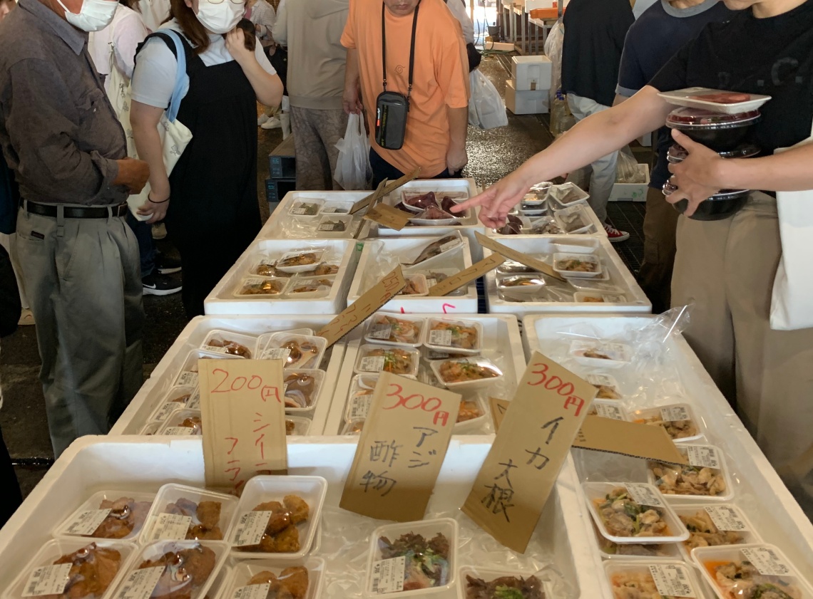・落札した魚は場内で刺身におろしてもらってすぐ食べられる。焼きたてでぬくもりの残るカツオのタタキを味わう!