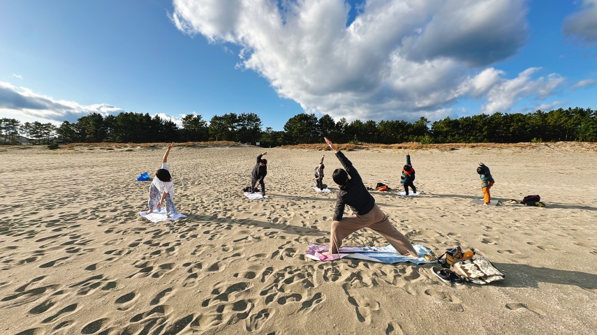 ・砂浜ヨガ(砂浜の上で気持ちよく体をほぐし、呼吸を整える)