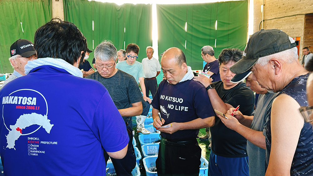 翌朝は競り見学。朝焼けの海を背景に、毎朝、久礼漁協では、仲買人や鮮魚店の関係者が集まり、カツオの目利きの真剣勝負が繰り広げられています。